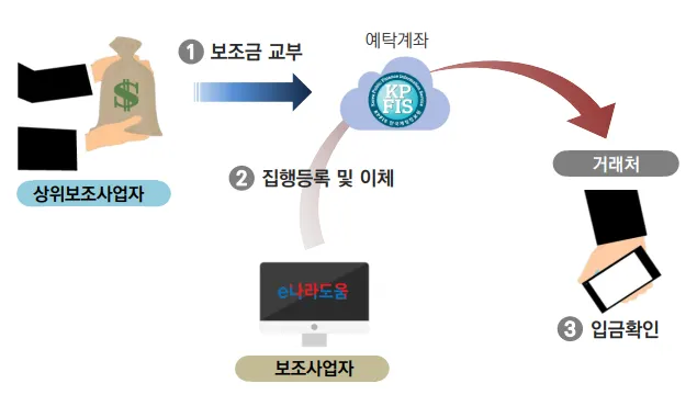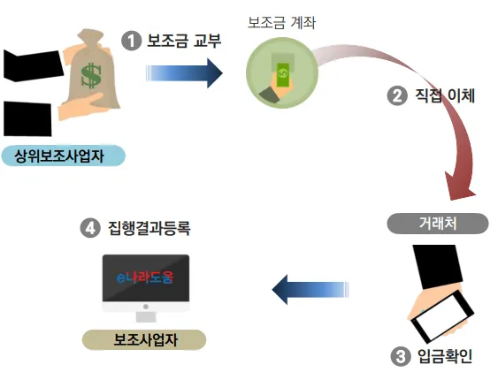 상위보조사업자는 보조사업자의 보조금 계좌로 보조금을 교부하고, 보조사업자는 직접 이체 (계좌이체, 은행 방문 이체 등) 후, e나라도움에 집행 결과를 등록합니다.